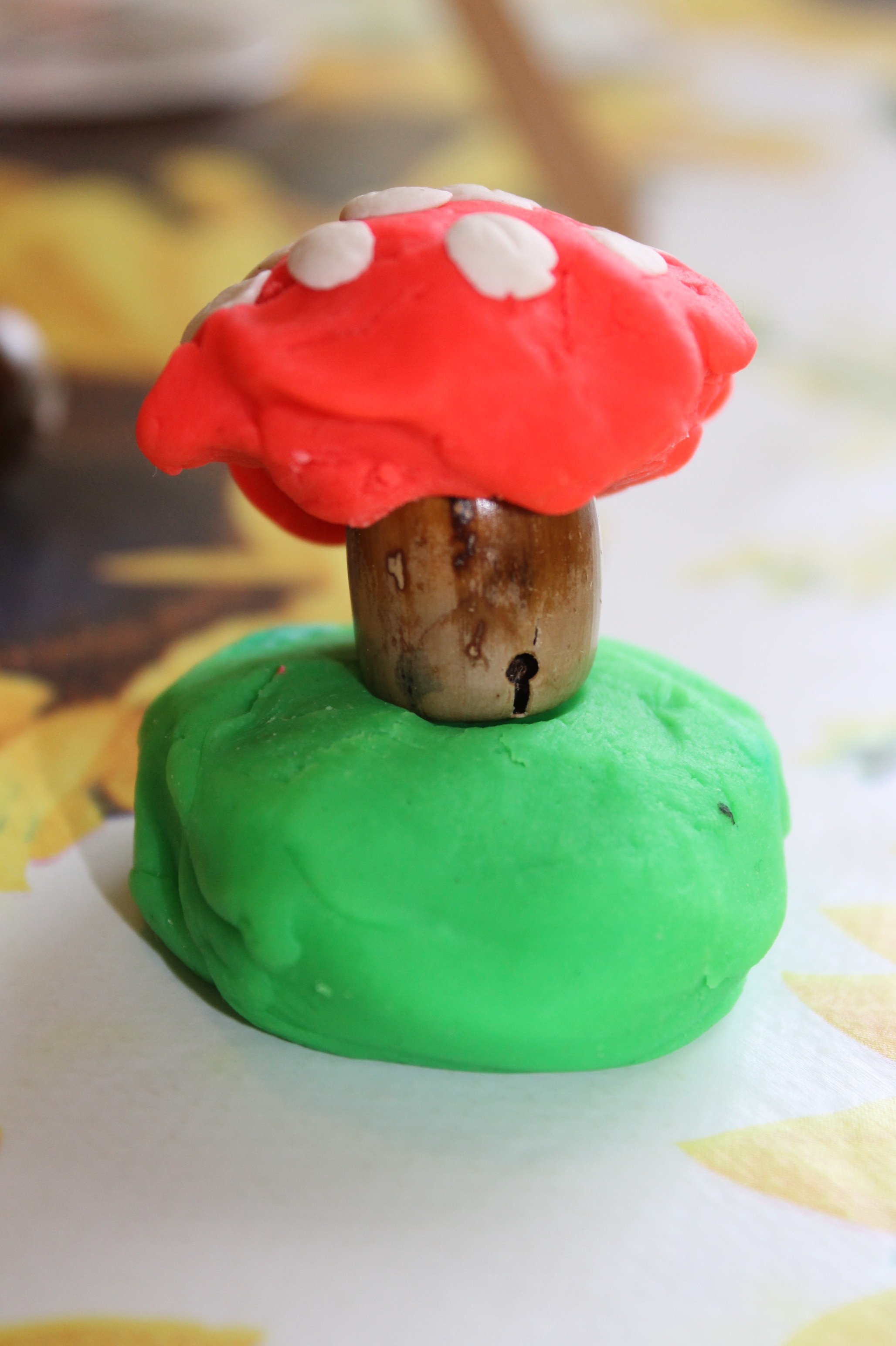 I made this with my daughter the other day. She’d been collecting acorns and had found one with a little hole in. ‘Then I stuck my nail in and it made a keyhole!’ she said proudly. So I suggested we add a playdough top to it to make it into a fairy toadstool. Wonder what kind of a fairy would live in it?