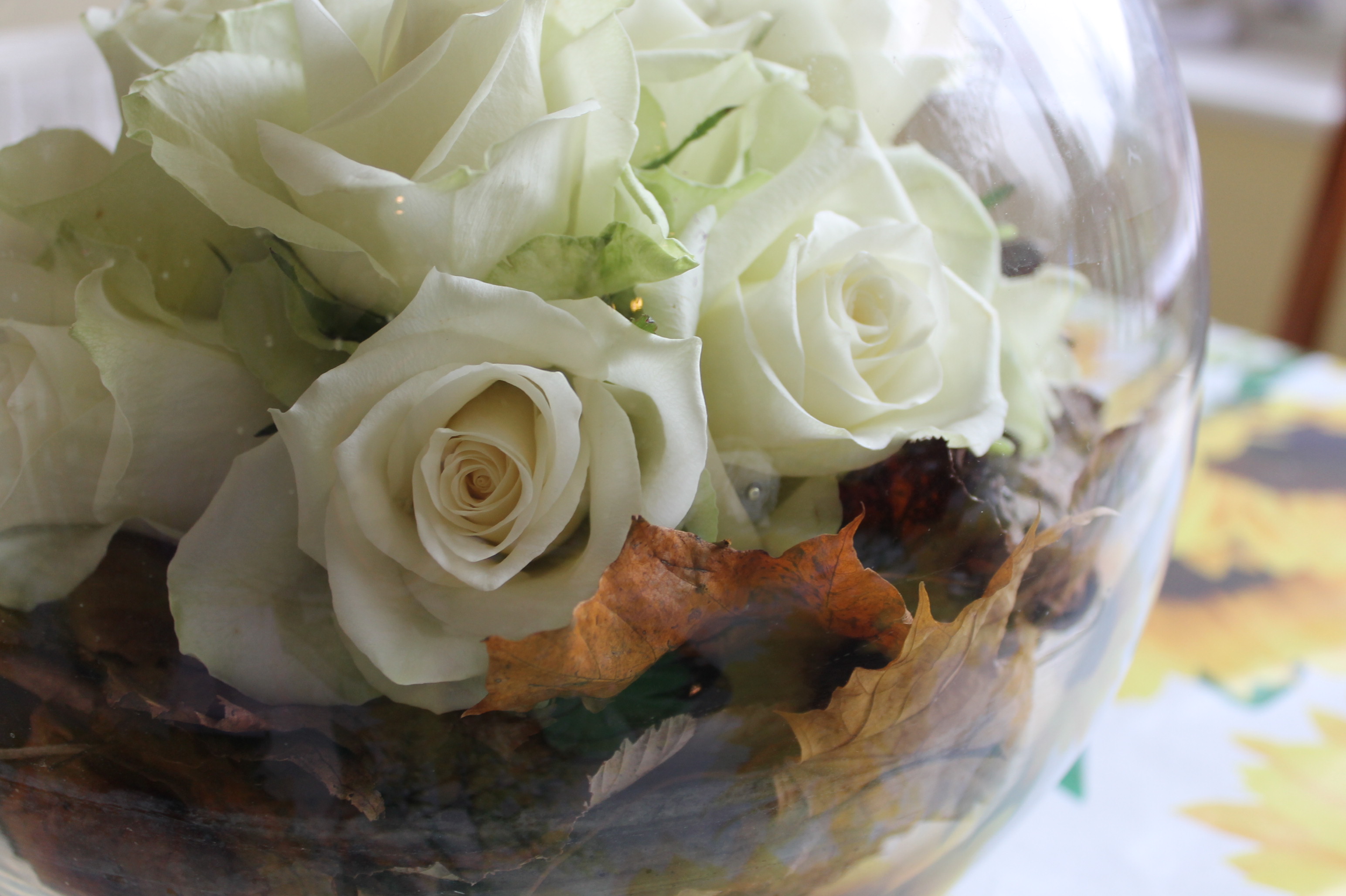 I have a large fishbowl vase which is a souvenir of our wedding day. I put a smaller vase inside it and filled it with water. Then I filled the gap between the inner and outer vase with dead leaves that my daughter collected two weeks ago (they’ve been sitting on the sideboard in a basket ever since). Then I cut the roses quite short and put them in the inner vase. Voila! I’m really pleased with the result: