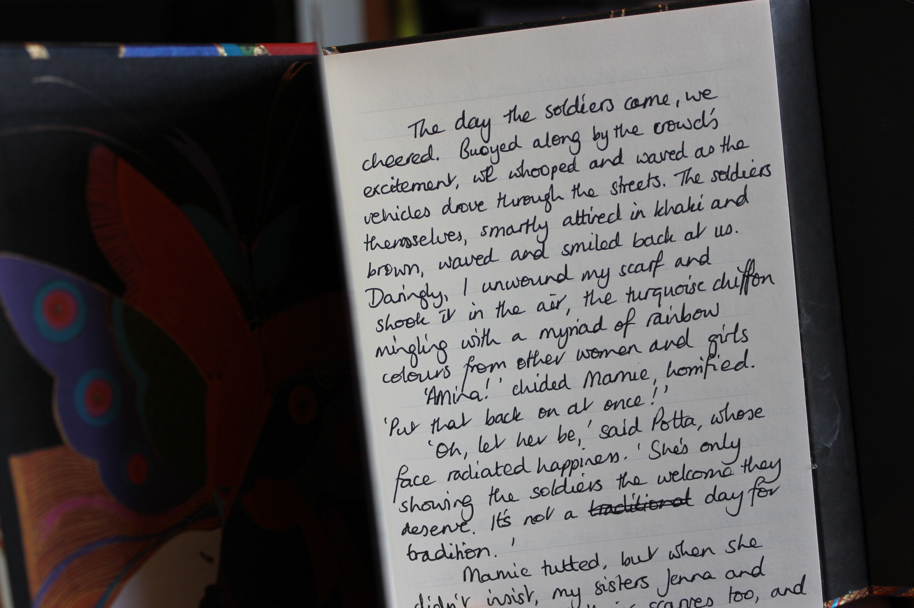 Due to a small glitch, the photo I meant to go with the post hasn’t appeared, so here it is below. It’s important because it’s a photo of the notebook in which I wrote my first draft – and you can compare the opening paragraph with the final version in the printed book.