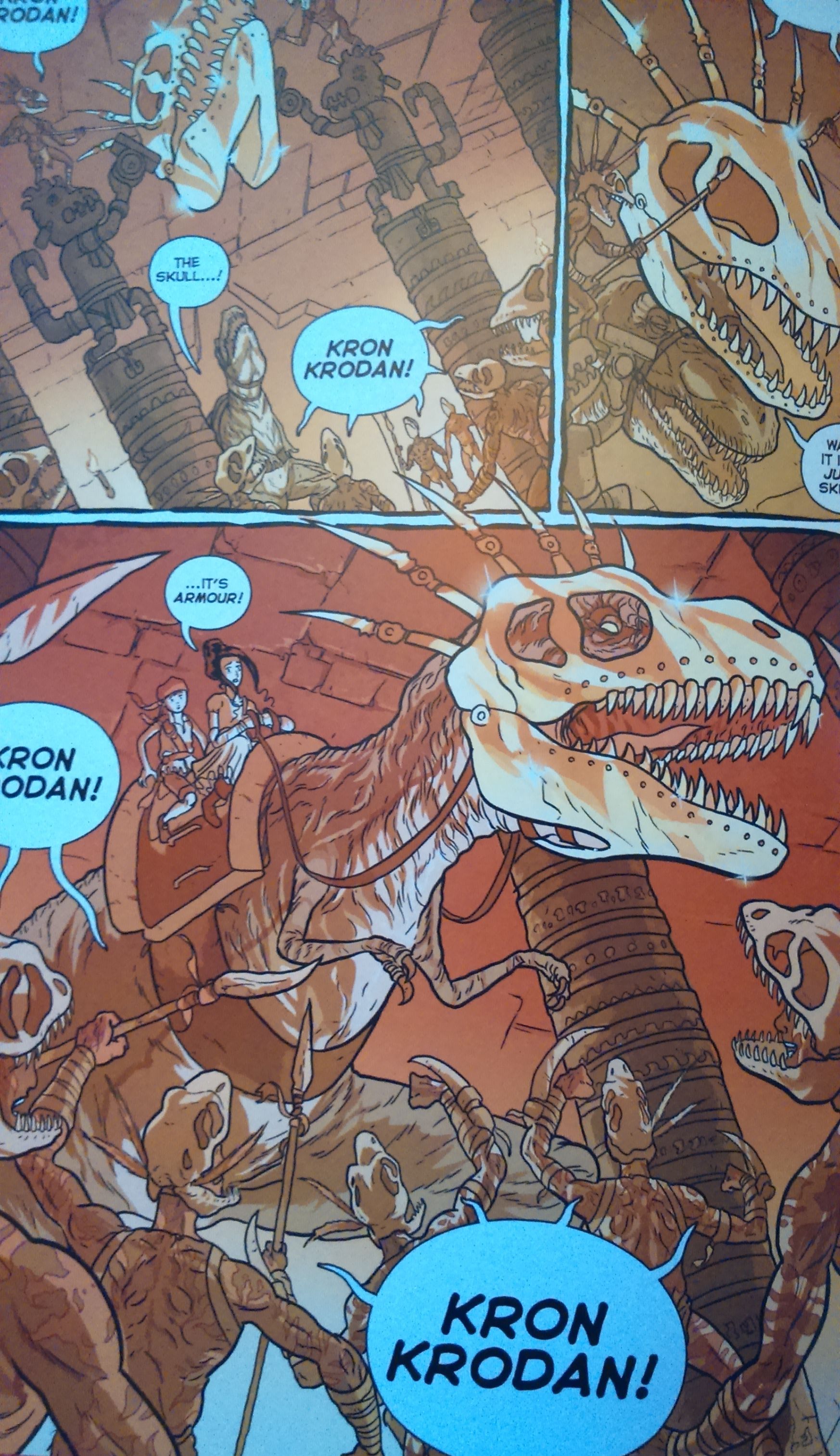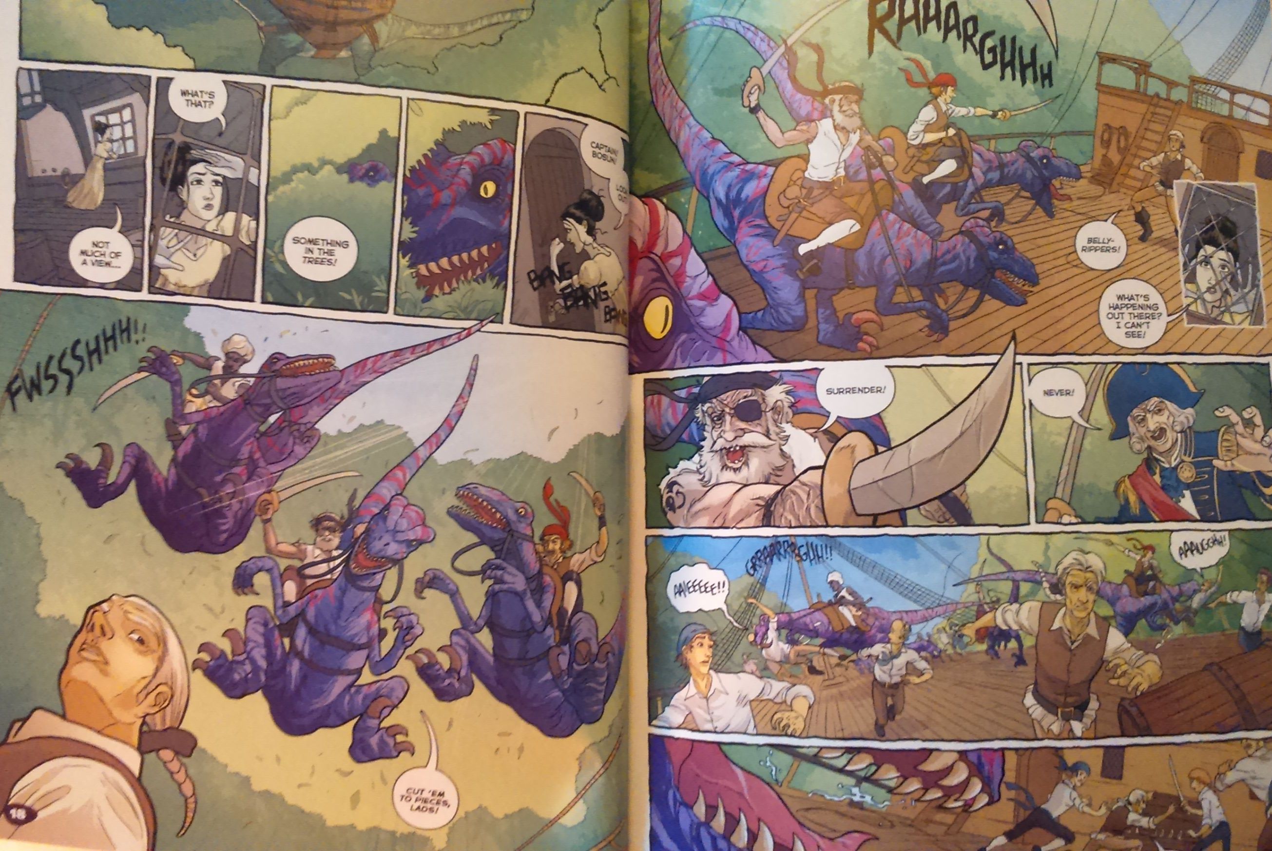 With such a strong basic concept (Pirates! Dinosaurs!) you could be forgiven for thinking that the story doesn’t really matter all that much. But like any good adventure romp, the plot has to hold up to the weight of expectation, and not only does it do that with ease but the characters are larger than life and instantly accessible. Sophie is a likable and energetic heroine, with a sense of fearlessness and a confidence that stands her in good stead in many situations. (My only question about her is the length of her yellow dress, which shortens in later panels to knee-length. Much more practical for riding dinosaurs but no explanation of where the knee-to-ankle bit went.)