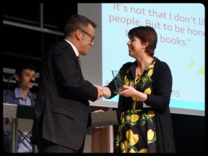 Yesterday, only the winner of the Primary category, David Baddiel, was there to join me – we missed you, Emma Yarlett! (Emma won the picture book category with her wonderful book Nibbles the Book Monster.) And in fact David had to leave after his acceptance speech because of his son’s birthday, so I was able to bask in solo glory after that…!