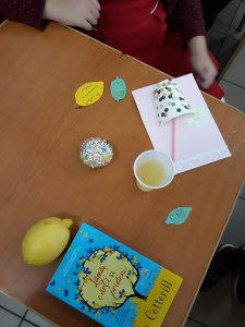 Every student brought from home a thing related to the book, talked about it and about why they chose it. They brought lemons, books, a cooking book, a diy small house like the one Mae and Calypso wrote their book in, a diy small book looking like the one wrote by the two characters, a list of book recommendations inspired by the titles mentioned in your book…