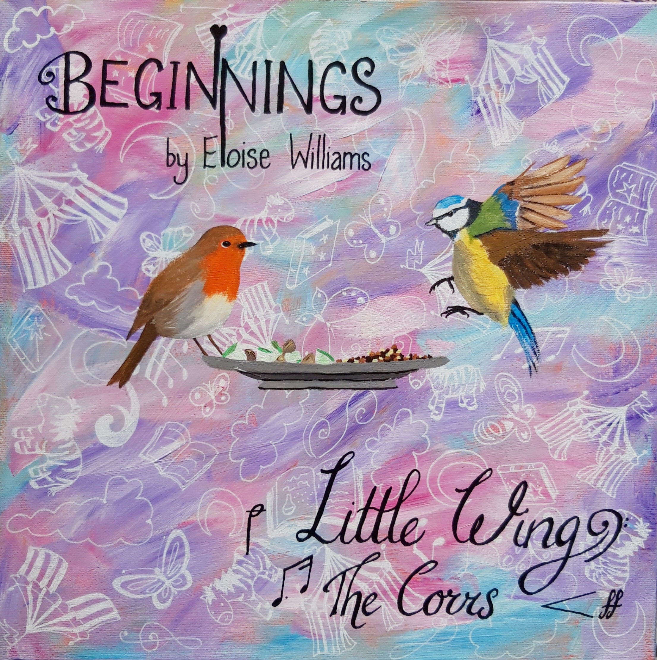 EmpathyLab asked me to create an image that included the title of the story and the title of the song. I could have done it on the computer but I really love painting and I wanted to have a go at painting some garden birds. I began by painting the whole canvas in a mixture of pinks, purples, blues and whites. When it dried I drew repeated images of a circus tent, a cloud, the moon, fairytale books, butterflies and zebras. Then I painted in vivid realistic colours the two garden birds (a robin and a blue tit) and the plate that appears in the story. The girl adds seeds; her neighbour adds apples and nuts.