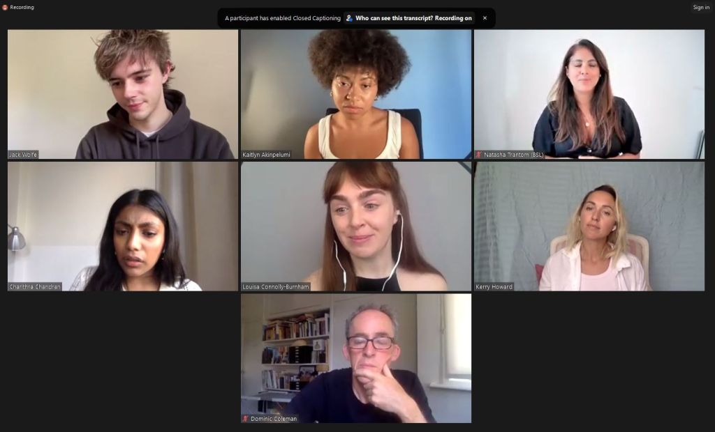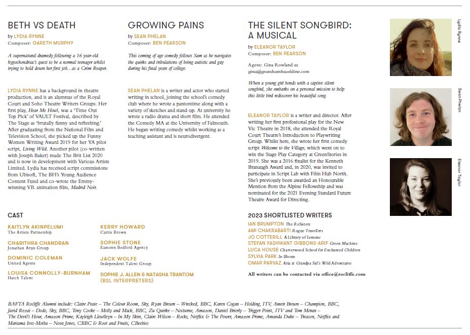 The three images above show a screenshot from the drama workshop (rehearsed reading) at the online industry showcase, the descriptions of the three winning finalists’ concepts, and a slide shown at the showcase listing all the shortlisted writers and their pieces.