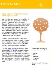 The Jubilee Centre at Birmingham University has created some worksheets of ideas aimed at parents who are interested in engaging more deeply with their children over the themes and issues of A Library of Lemons. There is a list of suggested discussion points relating to kindness and compassion, and there is a prompt, exemplar and template to help children write a letter to one of the characters. Many thanks to Dr Katy Dineen, Dr Catherine Darnell and the university for allowing me to share them here: just click on the image to be taken to the PDF download page. If you find them useful, do please tweet them at @jubileecentre1 to let them know!